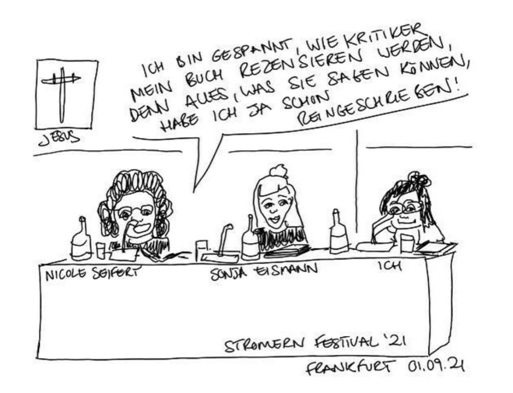 Erstmal möchte ich alle herzlich willkommen heißen, die neu dazu gekommen sind, und allen danken, die schon länger und immer noch dabei sind. Ohne die Begeisterung von Euch und Ihnen, ohne den Austausch und immer wieder motivierendes Feedback, wäre es überhaupt nie zu all dem gekommen, was im September war, und das war eine ganze Menge. Der Monat startete noch vor Erscheinen des Buches beim Frankfurter Festival stromern mit der Veranstaltung „Das (un)sichtbare Patriarchat“. Rebekka Endler, die Autorin von Das Patriarchat der Dinge, Sonja Eismann, Mitherausgeberin des Missy Magazine, und ich haben über patriarchale Strukturen im öffentlichen Raum und im Literaturbetrieb gesprochen und versucht, eine Antwort auf die Frage zu finden, warum wir eigentlich 2021 noch nicht weiter sind und immer noch über diese Probleme reden müssen. Das Gespräch haben wir am nächsten Morgen ganz ohne Publikum beim Frühstück auf der vielleicht schönsten Dachterrasse Frankfurts noch fortgesetzt. Und weil die Fotos von der Veranstaltung zwischenzeitlich verschollen waren, hat Rebekka Endler stattdessen einfach schnell diesen Cartoon gezeichnet.