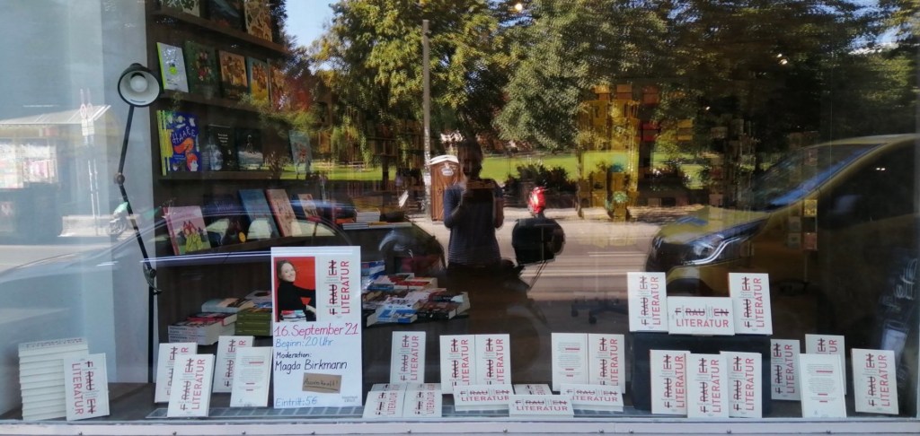 Weiter ging es in der folgenden Woche mit der offiziellen Buchpremiere von FRAUEN LITERATUR in der Buchhandlung Ocelot in der Berliner Brunnenstraße, in der ich selbst mal ein paar Jahre gelebt habe (als es das Ocelot noch nicht gab). Besonders toll war hier, dass ich so viele Menschen, mit denen ich mich seit langem in den sozialen Medien austausche, endlich persönlich kennengelernt habe. Außerdem war es ein besonderes Vergnügen, mich mit der Buchhändlerin Magda Birkmann, die die Lesung moderierte und selbst Expertin für Literatur von Frauen ist, über das Vergessen und Wiederentdecken von Autorinnen zu unterhalten. Wer ihren Newsletter Magda liest. Und liest. Und liest. noch nicht kennt: ganz dringende Empfehlung. Kaum fassen konnte ich, dass das Ocelot meinem Buch eine Woche vor der Lesung dieses Schaufenster gewidmet hat:
