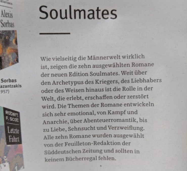 „Zehn große Romane der Weltliteratur“, die „in keinem Bücherregal fehlen“ sollten – so kündigte die Süddeutsche Zeitung Ende Oktober in einer Anzeige ein neues Produkt an, das über ihren Onlineshop erhältlich ist. Das Besondere: Alle Autoren sind Männer. Und das ist reine Absicht, gezeigt werden soll nämlich, „wie vielseitig die Männerwelt wirklich ist“. Der Schuber mit dem wonnigen Titel Soulmates enthält allerlei zwischen Alexis Sorbas und Blade Runner. Satire? Leider nein. „Welten der Wildheit und der Lebensfreude“ weiterlesen